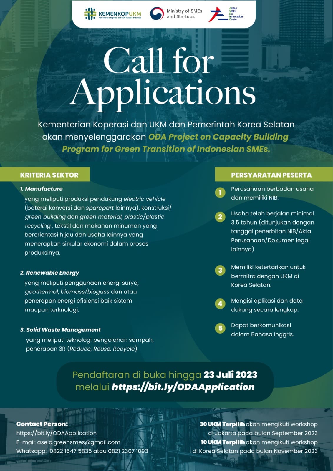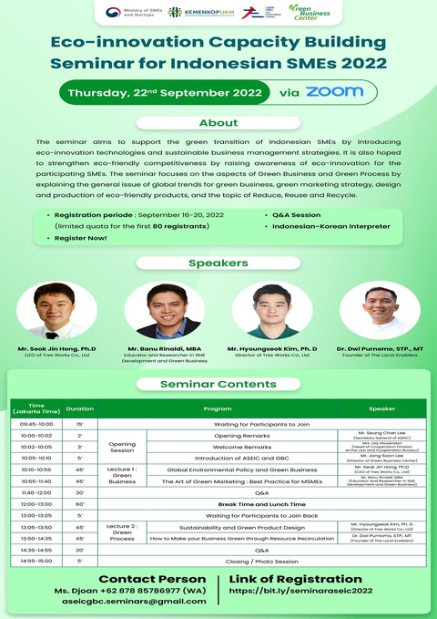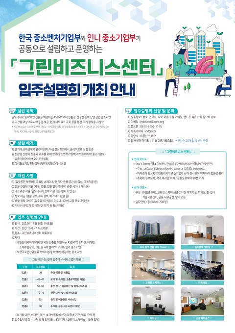 Announcement for Public News & Notice Announcement for Public Announcement for Tenants Sep 19, 2023 The Announcement of the 1st Evaluation of the 4th KOREA-ASEAN Business Model Competition for SDGs 2023 View More Sep 1, 2023 Extended Registration Period for the 4th KOREA-ASEAN Business Model Competition for SDGs 2023 View More Jul 20, 2023 ODA Project on Capacity Building for Green Transition of Indonesian SMEs View More Jul 17, 2023 The 4th KOREA-ASEAN Business Model Competition for SDGs 2023 View More Feb 14, 2023 (포스터) 그린비즈니스센터 입주 모집 공고 View More Nov 23, 2022 그린비즈니스센터 입주설명회 개최 안내 View More Sep 16, 2022 Eco-Innovation Capacity Building Seminar for Indonesian SMEs 2022 View More Sep 7, 2022 The Announcement of the Winners of the Korea-ASEAN Business Model Competition for SDGs 2022 View More Aug 15, 2022 The Announcement of the Top 10 of the Korea-ASEAN Business Model Competition for SDGs 2022 View More «12345»
