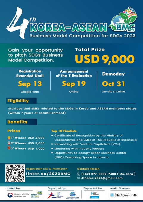 Sep 1, 2023 Extended Registration Period for the 4th KOREA-ASEAN Business Model Competition for SDGs 2023 View More